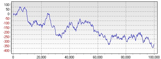 Nach knapp 5.000 weiteren Würfen, insgesamt exakt nach 9.546 Coups, ist erstmals die Minuszone mit einem Euro Verlust erreicht. Der Spieler wird in den restlichen 90.454 Coups nie wieder auf Null kommen.